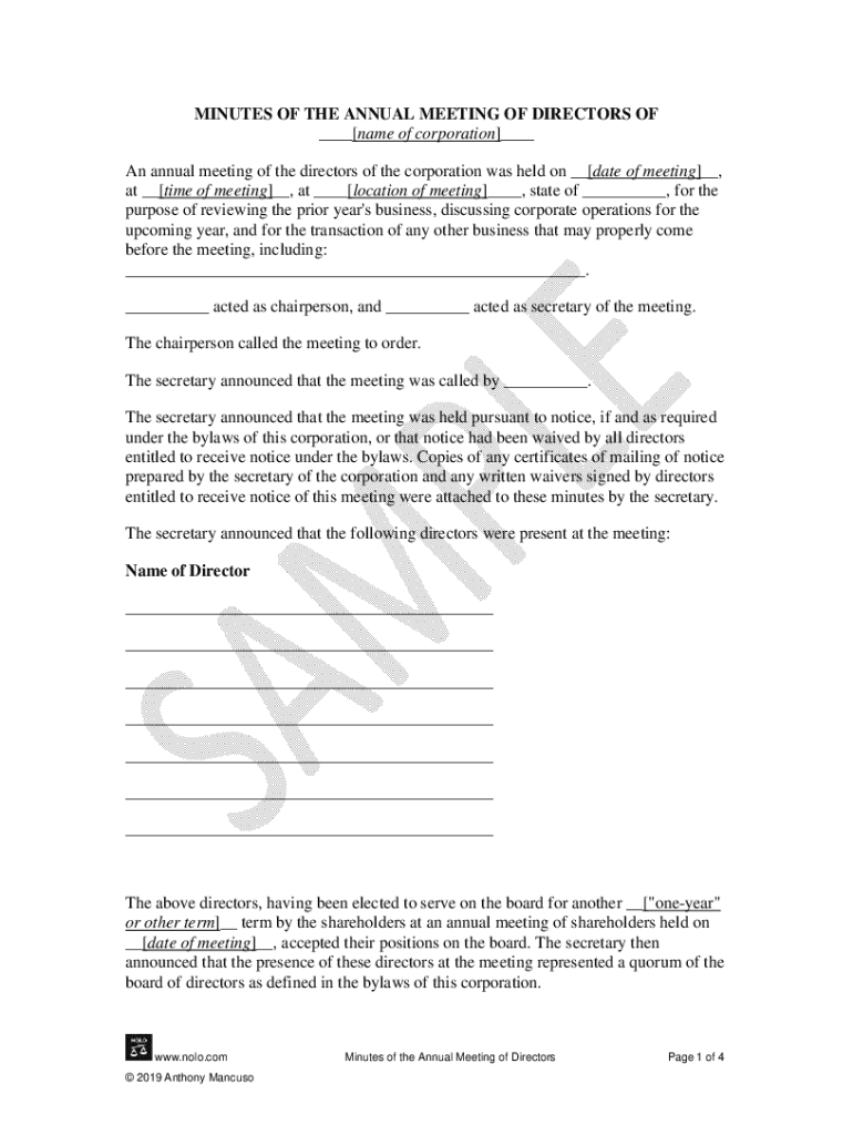 MINUTES OF THE ANNUAL MEETING OF DIRECTORS OF name of corporation An annual meeting of the directors of the corporation was held on date of meeting, at time of meeting, at location of meeting, state