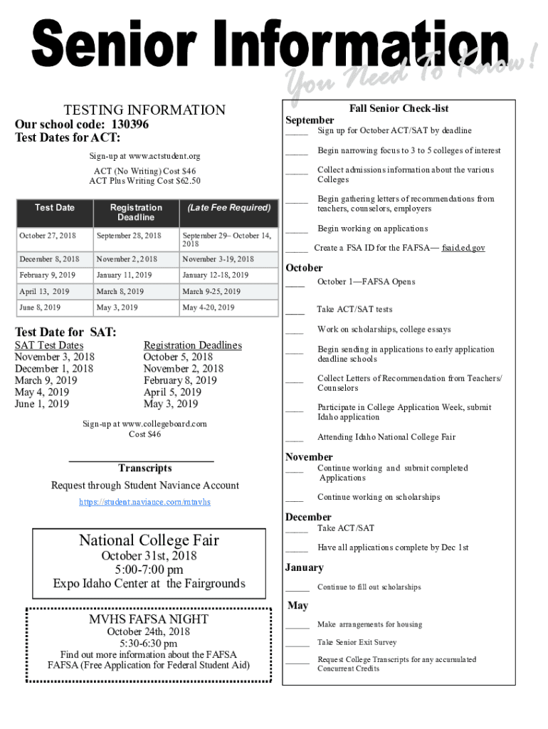 TESTING Information school code: 130396 Test Dates for ACT:Sign up at www.actstudent.org ACT (No Writing) Cost $46 ACT Plus Writing Cost $62.50 Test Deregistration Deadline(Late Fee Required)October