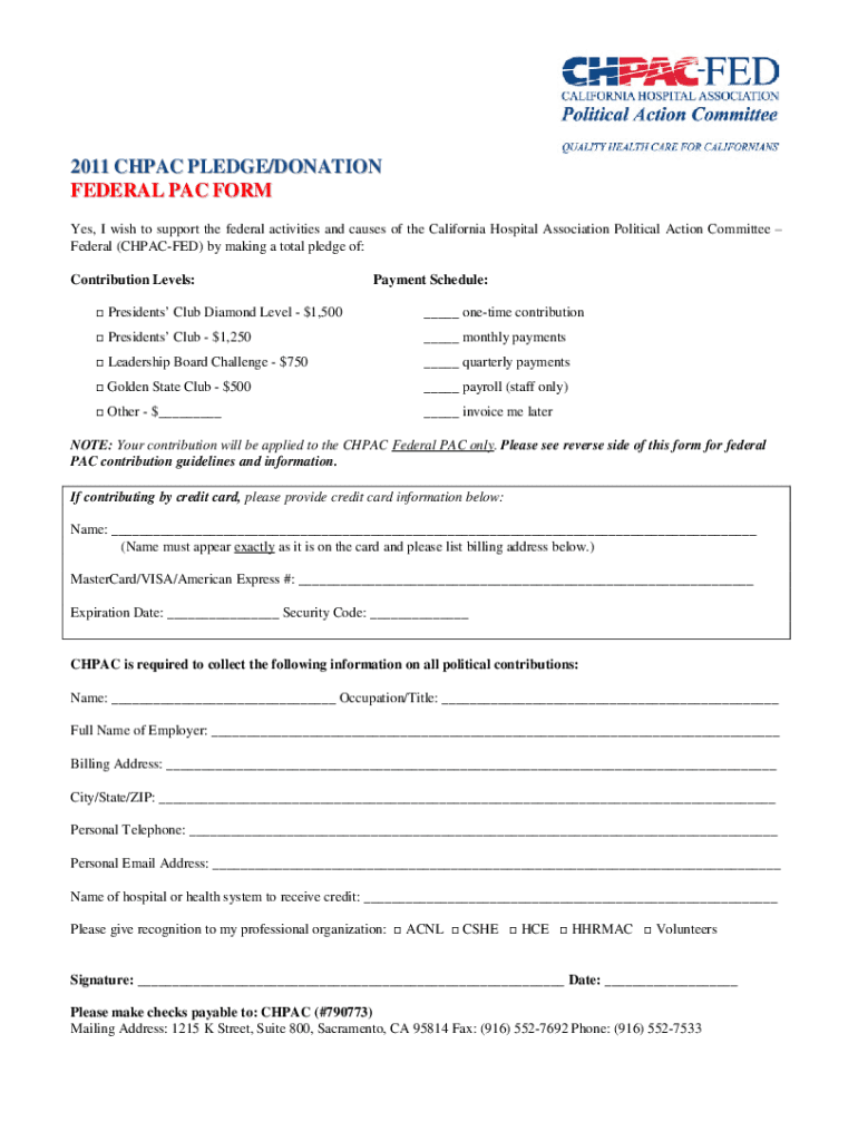 2011 CH PAC PLEDGE/DONATION FEDERAL PAC FORM Yes, I wish to support the federal activities and causes of the California Hospital Association Political Action Committee Federal (CHAFED) by making a