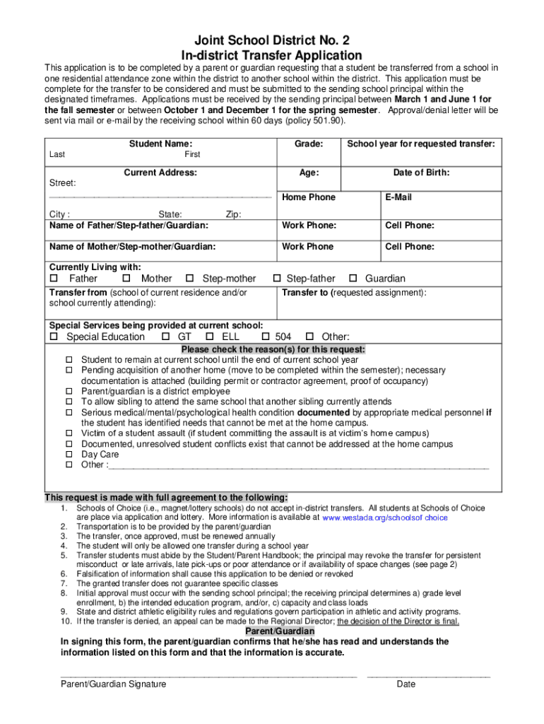 Joint School District No. 2 In district Transfer Application This application is to be completed by a parent or guardian requesting that a student be transferred from a school in one residential attendance