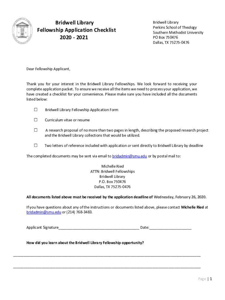 Bridge Library Fellowship Application Checklist 2020 2021Bridwell Library Perkins School of Theology Southern Methodist University PO Box 750476 Dallas, TX 752750476Dear Fellowship Applicant, Thank
