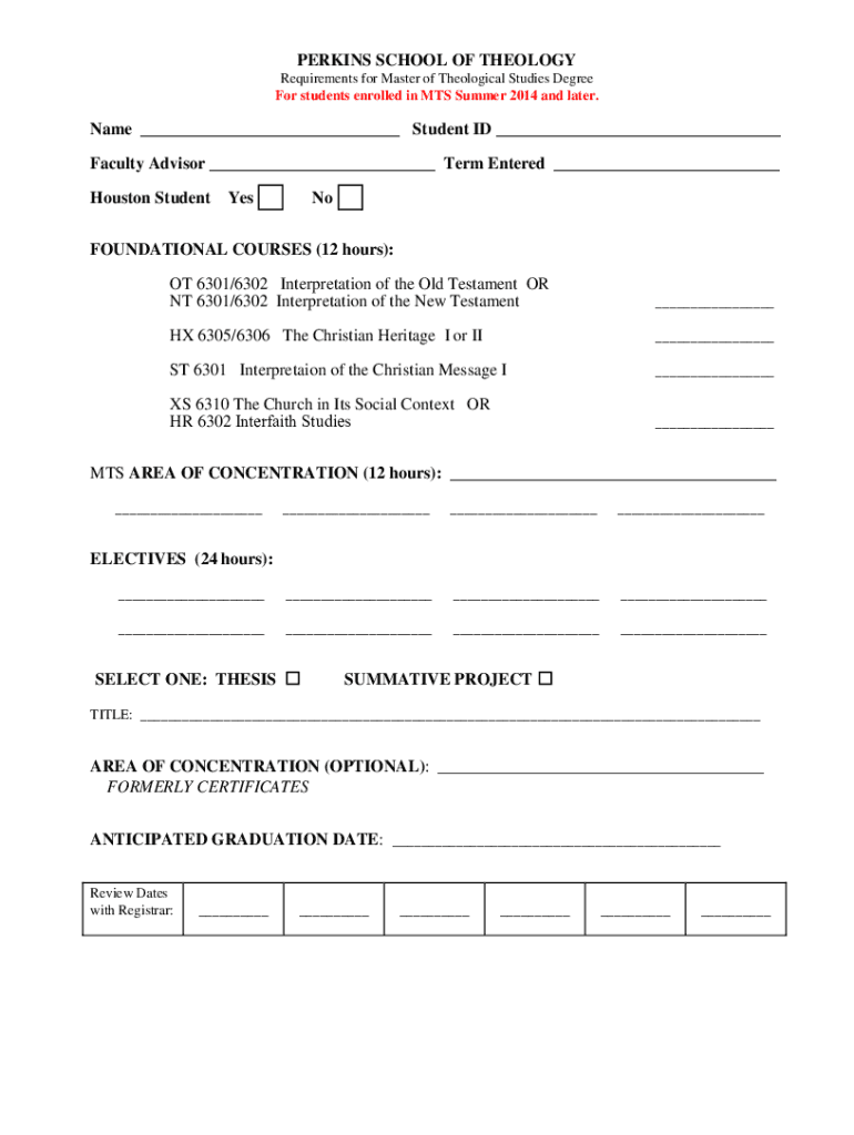 PERKINS SCHOOL OF THEOLOGY Requirements for Master of Theological Studies Degree For students enrolled in MTS Summer 2014 and later. Name Student ID Faculty Advisor Term Entered Houston Student Yes