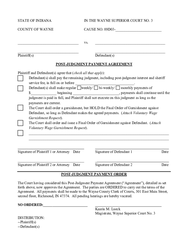 STATE OF INDIANAN THE WAYNE SUPERIOR COURT NO. 3COUNTY OF WAYNECAUSE NO. 89D03 vs. Plaintiff(s) Defendant(s)MISJUDGMENT PAYMENT AGREEMENT Plaintiff and Defendant(s) agree that (check all that apply):