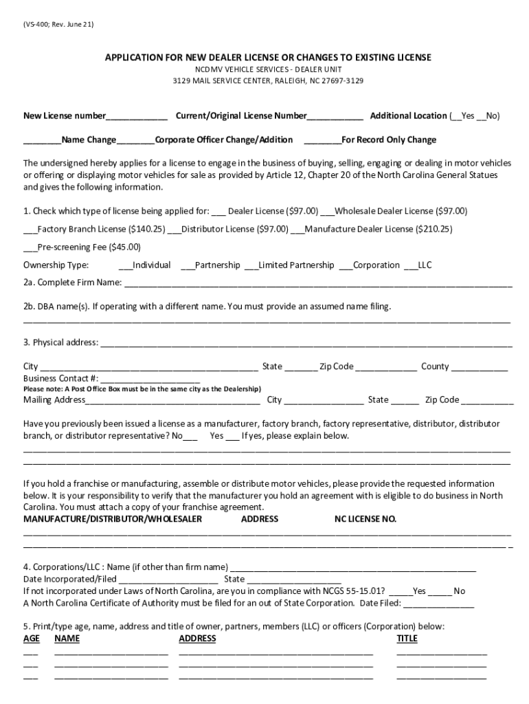 (VS400; Rev. June 21)APPLICATION FOR NEW DEALER LICENSE OR CHANGES TO EXISTING LICENSE NC DMV VEHICLE SERVICES DEALER UNIT 3129 MAIL SERVICE CENTER, RALEIGH, NC 276973129New License number Current/Original