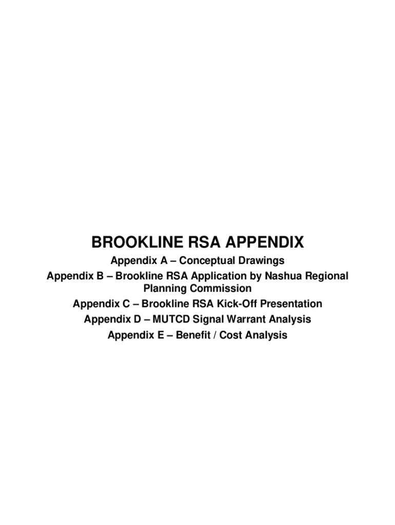 BROOKLINE RSA APPENDIX A Conceptual Drawings Appendix B Brookline RSA Application by Nashua Regional Planning Commission Appendix C Brookline RSA Kickoff Presentation Appendix D MUTED Signal Warrant