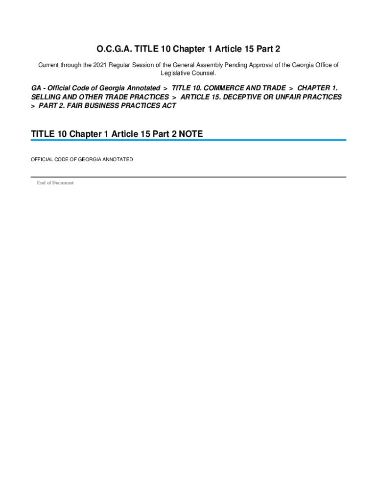 O.C.G.A. TITLE 10 Chapter 1 Article 15 Part 2 Current through the 2021 Regular Session of the General Assembly Pending Approval of the Georgia Office of Legislative Counsel. GA Official Code of Georgia