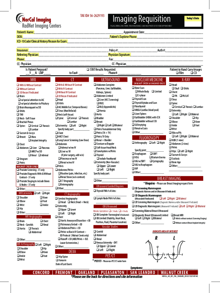 TAX ID# 562629193Imaging RequisitionTodays Displease BRING THIS FORM, YOUR INSURANCE CARD AND PHOTO ID TO YOUR APPOINTMENTPatients Name: Appointment Date: DOB: Patients Daytime Phone: ICD10 Code/Clinical