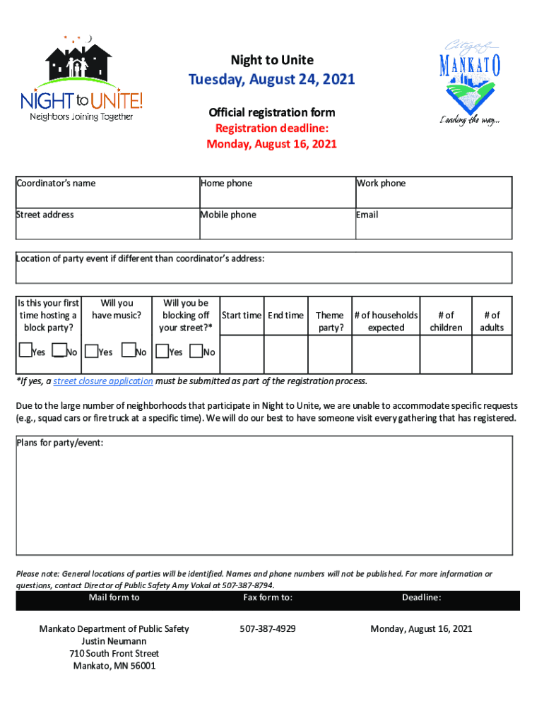Night to Unite Tuesday, August 24, 2021, Official registration form Registration deadline: Monday, August 16, 2021, RegistratnformationCoordinators namesake foreword Longstreet address Mobile phoneEmailLocation