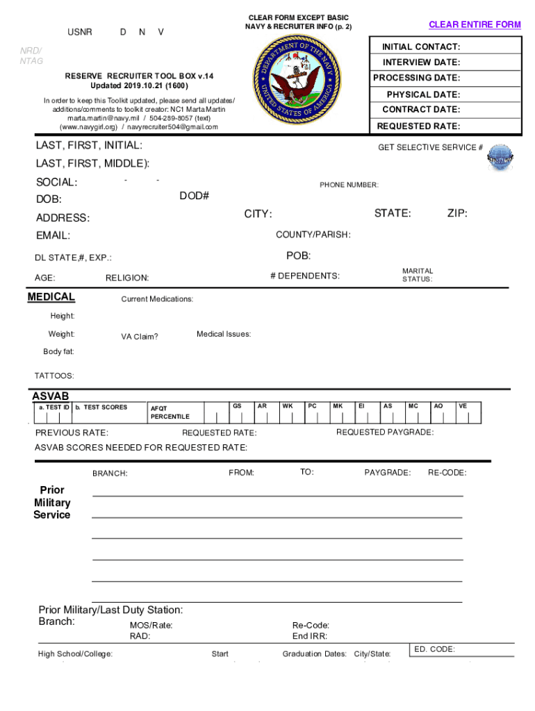 USNRDNCLEAR FORM EXCEPT BASIC NAVY & RECRUITER INFO (p. 2)CLEAR ENTIRE FORM INITIAL CONTACT:NRL/ NTAGINTERVIEW DATE: RESERVE RECRUITER TOOL BOX v.14 Updated 2019.10.21 (1600)PROCESSING DATE: PHYSICAL