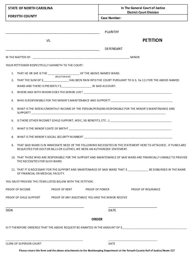 In The General Court of Justice District Court DivisionSTATE OF NORTH CAROLINA FORSYTH COUNTY Case Number: PLAINTIFF This's PETITIONS. DEFENDANT IN THE MATTER OF:, MINOR YOUR PETITIONER RESPECTFULLY