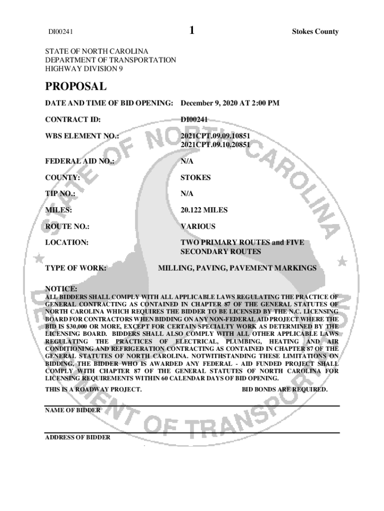 1DI00241Stokes CountySTATE OF NORTH CAROLINA DEPARTMENT OF TRANSPORTATION HIGHWAY DIVISION 9PROPOSAL DATE AND TIME OF BID OPENING: December 9, 2020, AT 2:00 PM CONTRACT ID:DI00241WBS ELEMENT NO.:2021CPT.09.09.10851