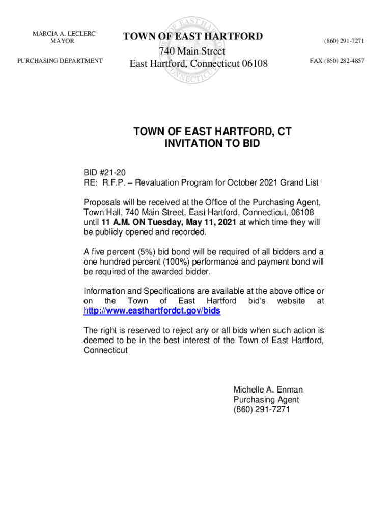 MARCIA A. LECLERC MAYOR PURCHASING DEPARTMENTTOWN OF EAST HARTFORD 740 Main Street East Hartford, Connecticut 06108(860) 2917271 FAX (860) 2824857TOWN OF EAST HARTFORD, CT INVITATION TO BID #2120