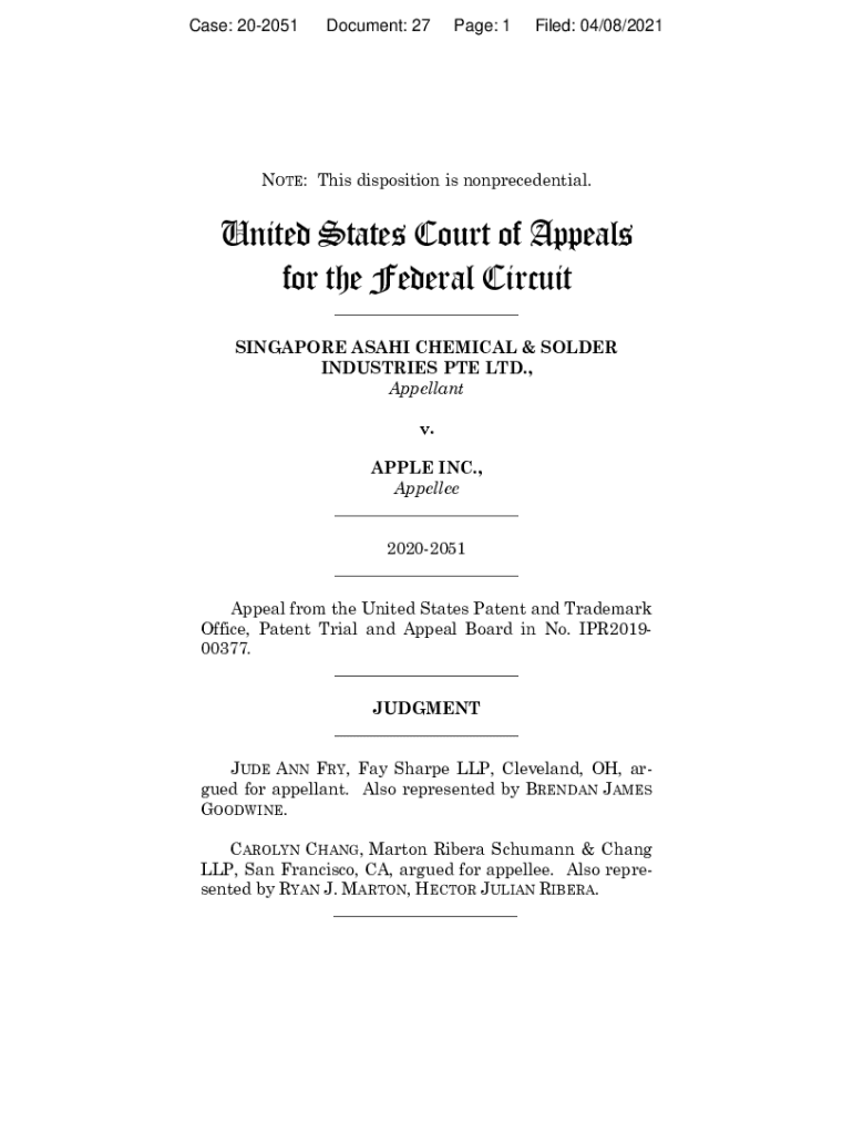 Case: 202051Document: 27Page: 1Filed: 04/08/2021NOTE: This disposition is nonresidential. United States Court of Appeals for the Federal Circuit SINGAPORE AS AHI CHEMICAL & SOLDER INDUSTRIES PTE LTD.,