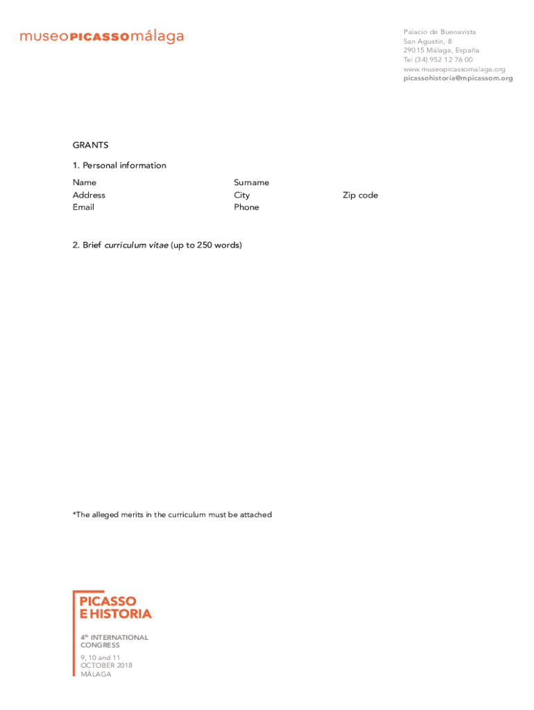 Palacios de Buenavista San Agustin, 8 29015 MAGA, ESAA Tel (34) 952 12 76 00 www.museopicassomalaga.org picassohistoria@mpicassom.orgGRANTS 1. Personal information NameSurname AddressCityEmailPhone2.