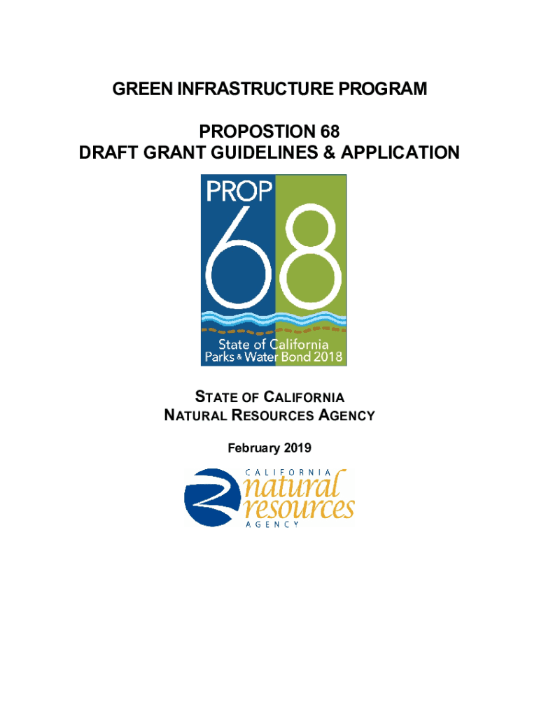 GREEN INFRASTRUCTURE PROGRAM PROPORTION 68 DRAFT GRANT GUIDELINES & APPLICATIONSTATE OF CALIFORNIA NATURAL RESOURCES AGENCY February 2019(Intentionally left blank)PUBLIC COMMENT MEETINGS SACRAMENTO