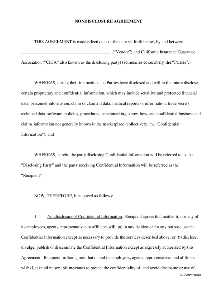 NONDISCLOSURE AGREEMENTS AGREEMENT is made effective as of the date set forth below, by and between. (Vendor) and California Insurance Guarantee Association (CIA also known as the disclosing party)