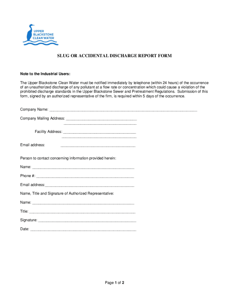 SLUG OR ACCIDENTAL DISCHARGE REPORT Footnote to the Industrial Users: The Upper Blackstone Clean Water must be notified immediately by telephone (within 24 hours) of the occurrence of an unauthorized
