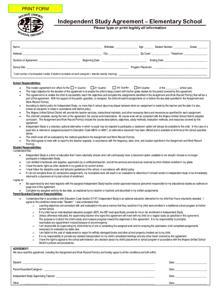 CLEAR FOOTPRINT Nonindependent Study Agreement Elementary School Please type or print legibly all informational: Birthdate: Age: Student Number: Grade: Address: City: Zip Code: Telephone: Duration