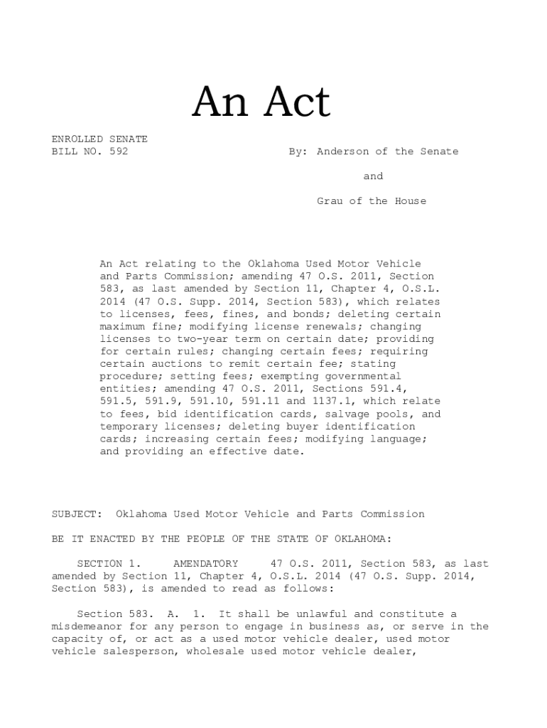 An Act ENROLLED SENATE BILL NO. 592By: Anderson of the Senate and Gray of the Housman Act relating to the Oklahoma Used Motor Vehicle and Parts Commission; amending 47 O.S. 2011, Section 583, as last