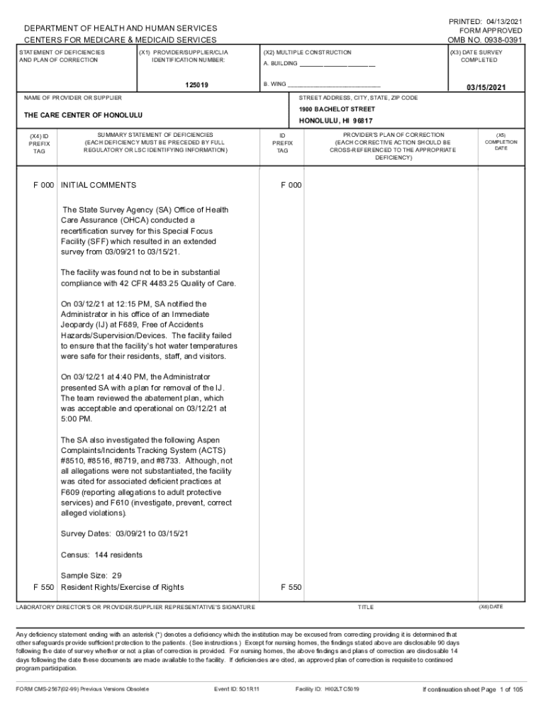 PRINTED: 04/13/2021 FORM APPROVEDDEPARTMENT OF HEALTH AND HUMAN SERVICES CENTERS FOR MEDICARE & MEDICAID SERVICES STATEMENT OF DEFICIENCIES AND PLAN OF CORRECTION(X1) PROVIDER/SUPPLIER/CIA IDENTIFICATION