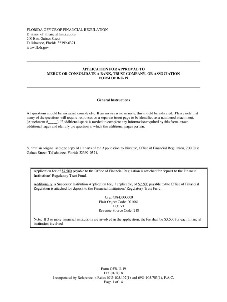 FLORIDA OFFICE OF FINANCIAL REGULATION Division of Financial Institutions 200 East Gaines Street Tallahassee, Florida 323990371 www.flofr.govAPPLICATION FOR APPROVAL TO MERGE OR CONSOLIDATE A BANK,