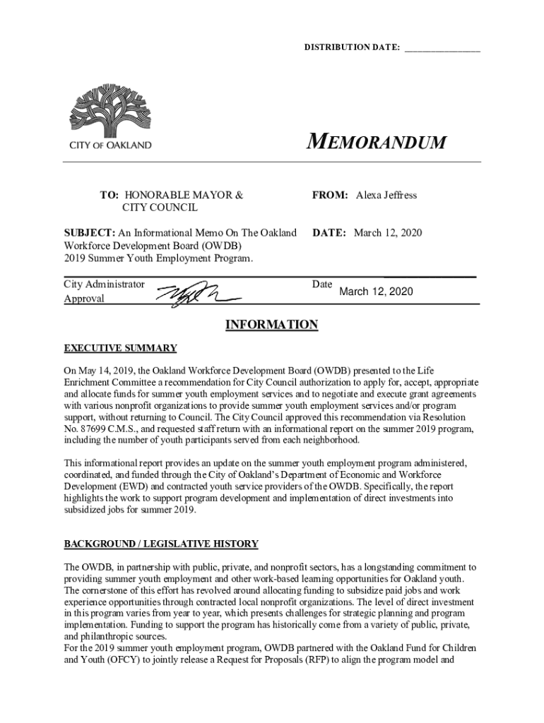 DISTRIBUTION DATE: MEMORANDUM TO: HONORABLE MAYOR & CITY COUNCILOR: Alexa JeffressSUBJECT: An Informational Memo On The Oakland Workforce Development Board (ODB) 2019 Summer Youth Employment Program.DATE: