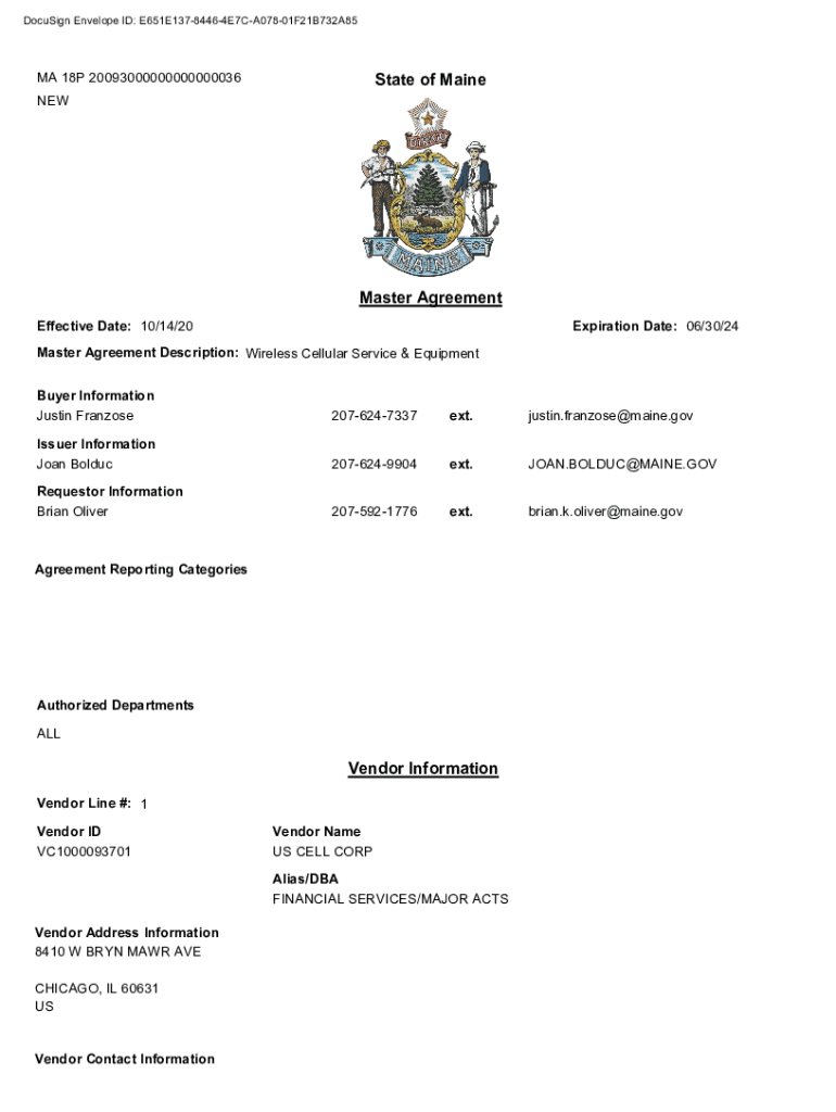 DocuSign Envelope ID: E651E13784464E7CA07801F21B732A85MA 18P 20093000000000000036State of MaineNEWMaster Agreement Effective Date: 10/14/20Expiration Date: 06/30/24Master Agreement Description: Wireless