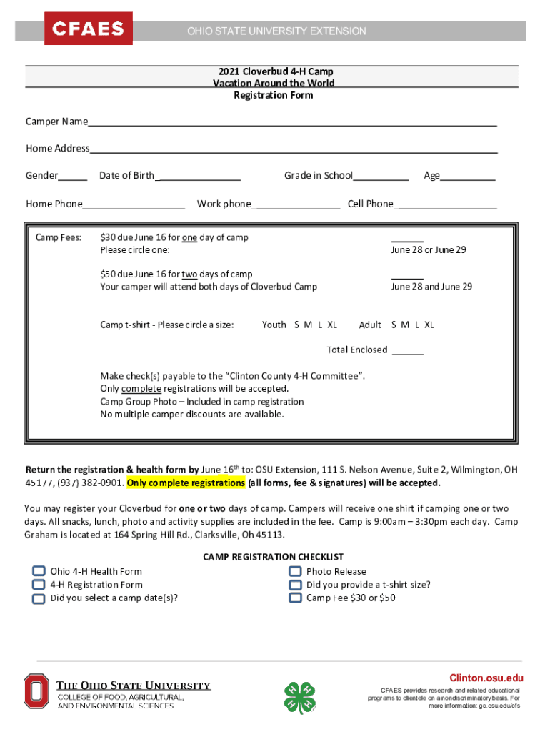 OHIO STATE UNIVERSITY EXTENSION OHIO STATE UNIVERSITY EXTENSION2021 Clover bud 4H Camp Vacation Around the World Registration Form Camper Name Home Address Generate of Birth Home Phone Camp Fees:Grade