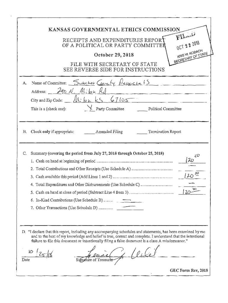 RECEIPTS AND EXPENDITURES REPORT OF A POLITICAL OR PARTY COMMITTED October 29, 2018FILE WITH SECRETARY OF STATE SEE REVERSE SIDE FOR INSTRUCTIONS. Name of Committee: Address:$UMV &, l. By)Ck l 5,