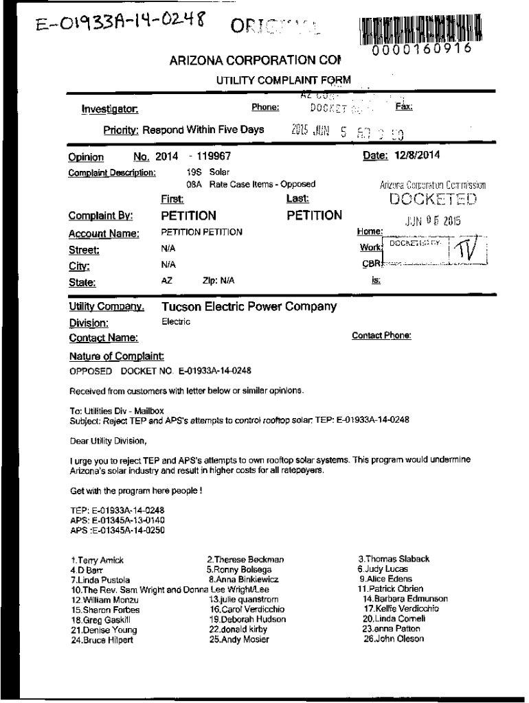 UTILITY COMPLAINT Form. Investigator: Priority: Respond Within Five Days Opinions Jun 5NO. 2014 119967 Complaint Description:Complaint BY: Account Name: Street: City: State: Utility Company. Division:7