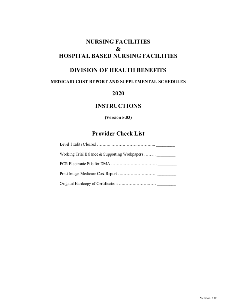 NURSING FACILITIES & HOSPITAL BASED NURSING FACILITIES DIVISION OF HEALTH BENEFITS MEDICAID COST REPORT AND SUPPLEMENTAL SCHEDULES2020 INSTRUCTIONS (Version 5.03)Provider Check List Level 1 Edits