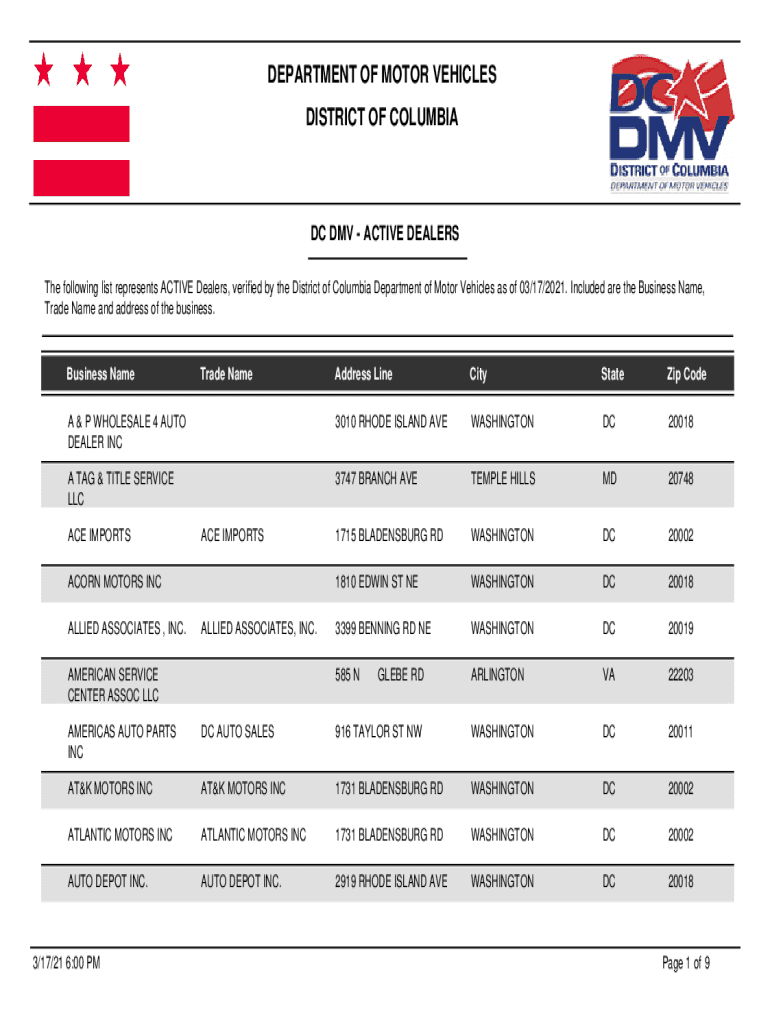 DEPARTMENT OF MOTOR VEHICLES DISTRICT OF COLUMBIA DMV ACTIVE DEALERS The following list represents ACTIVE Dealers, verified by the District of Columbia Department of Motor Vehicles as of 03/17/2021.