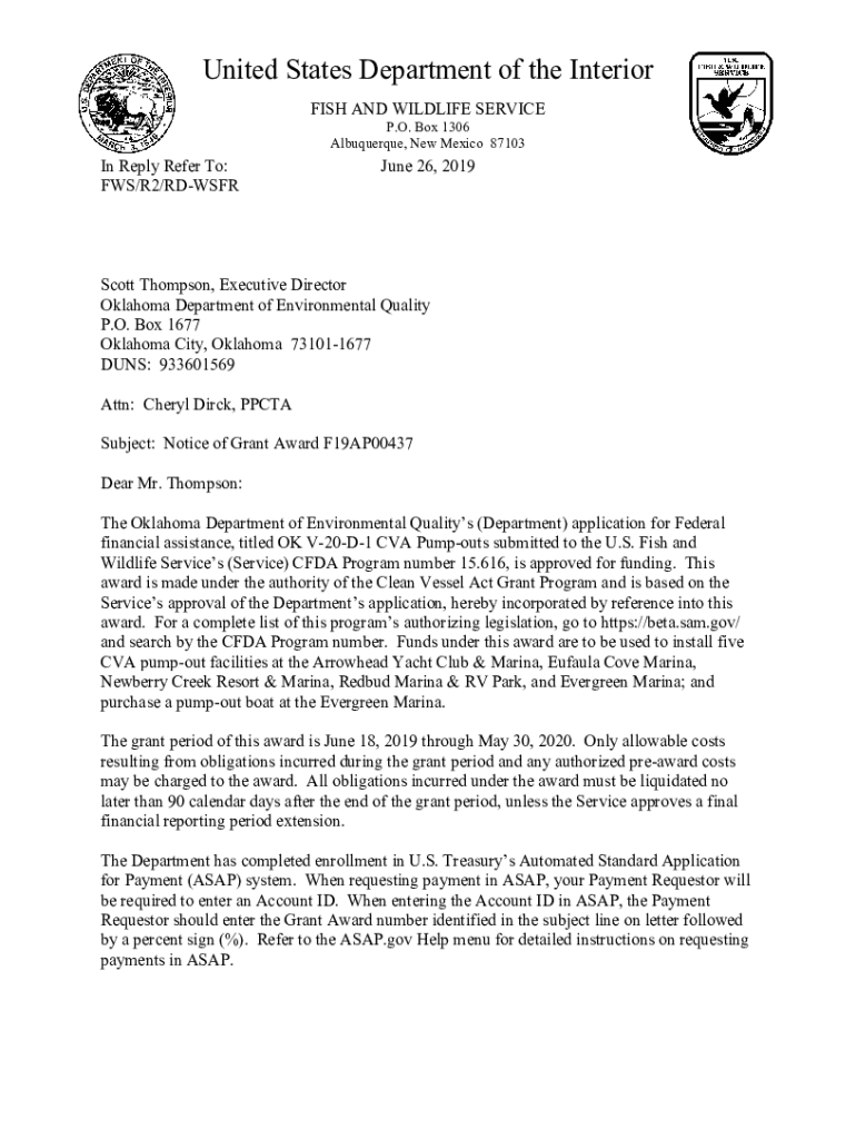 United States Department of the Interior FISH AND WILDLIFE SERVICE P.O. Box 1306 Albuquerque, New Mexico 87103In Reply Refer To: FRS/R2/RDWSFRJune 26, 2019Scott Thompson, Executive Director Oklahoma