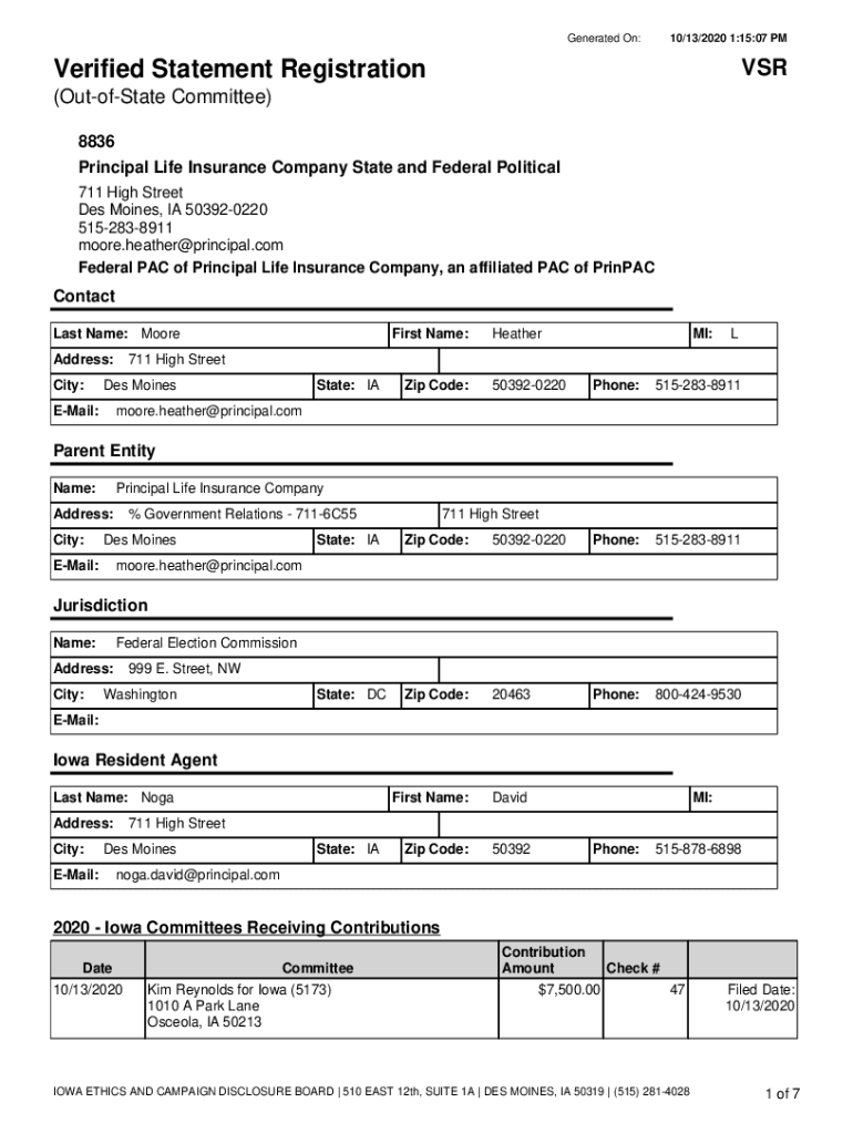 Generated On:10/13/2020 1:15:07 PMVSRVerified Statement Registration (OutofState Committee) 8836 Principal Life Insurance Company State and Federal Political 711 High Street Des Moines, IA 503920220