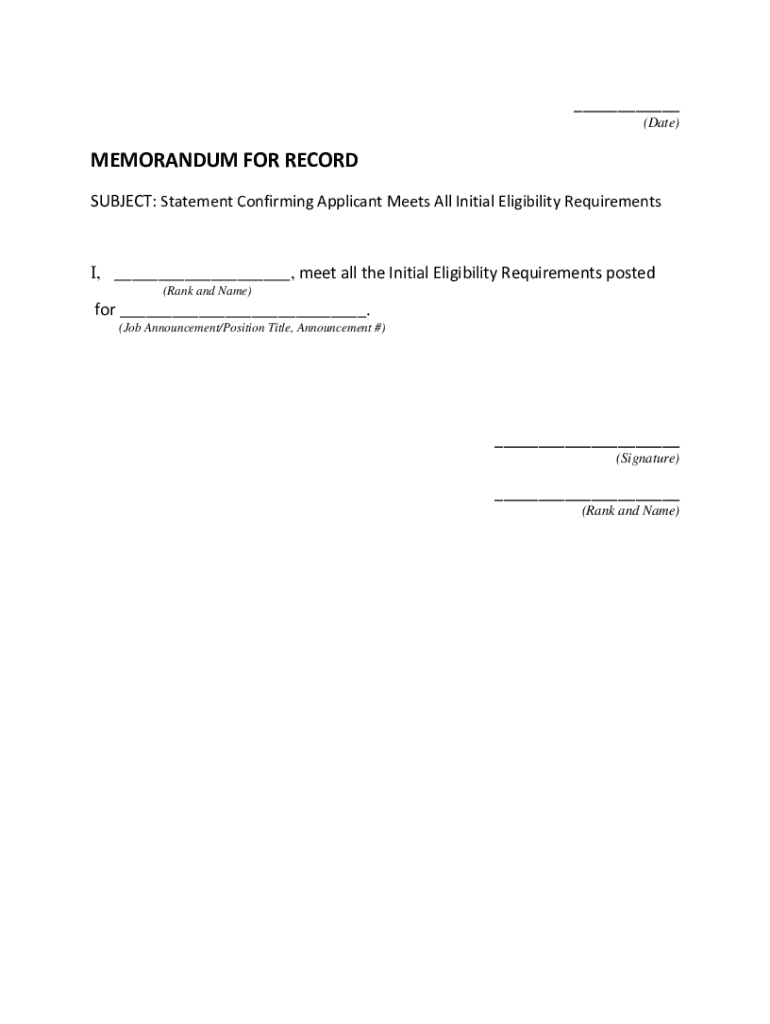 (Date)MEMORANDUM FOR RECORD SUBJECT: Statement Confirming Applicant Meets All Initial Eligibility Requirements, meet all the Initial Eligibility Requirements posted (Rank and Name)for. (Job Announcement/Position