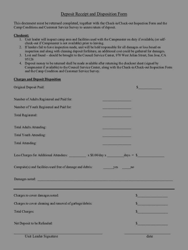 Deposit Receipt and Disposition Form This document must be returned completed, together with the Checking/Checkout Inspection Form and the Camp Conditions and Customer Service Survey to secure return
