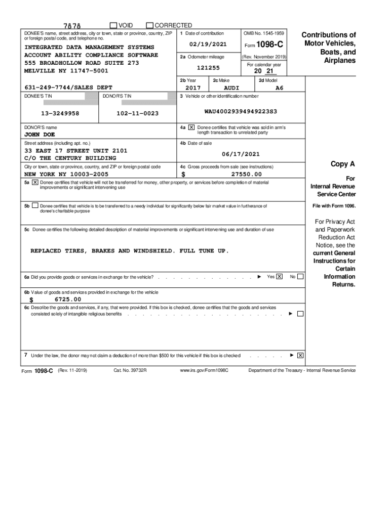 Form 1098-C - IDMS A is required to be filled out by both the donor and the recipient of a qualified vehicle contribution.