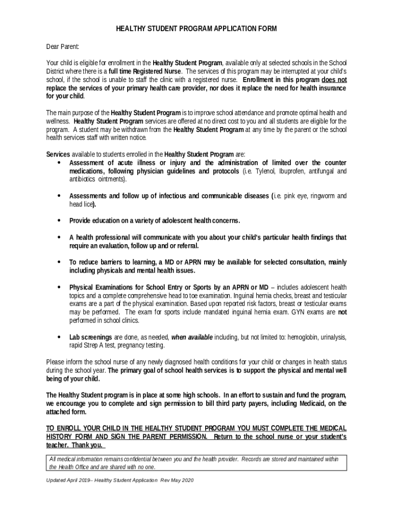HEALTHY STUDENT PROGRAM APPLICATION template instructions