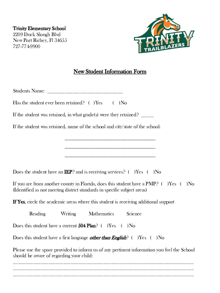 Trinity Elementary School 2209 Duck Slough Blvd New Port Richey, Fl 34655 7277749900New Student Information Form Students Name: Has the student ever been retained? ()Yes()Coif the student was retained,