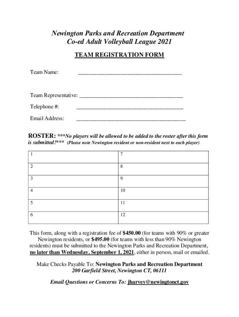 Newington Parks and Recreation Department Coed Adult Volleyball League 2021 TEAM REGISTRATION FORM Team Name: Team Representative: Telephone #: Email Address: ROSTER: ***No players will be allowed