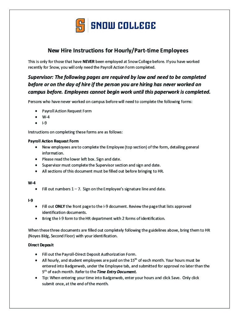 New Hire Instructions for Hourly/Part time Employees This is only for those that have NEVER been employed at Snow College before. If you have worked recently for Snow, you will only need the Payroll
