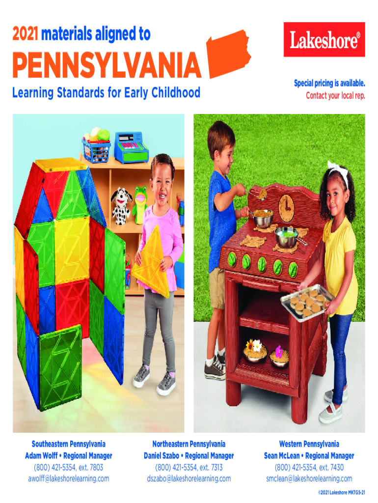 2021 materials aligned Pennsylvania Learning Standards for Early ChildhoodSoutheastern Pennsylvania Adam Wolff Regional Manager (800) 4215354, ext. 7803 awolff@lakeshorelearning.comNortheastern Pennsylvania
