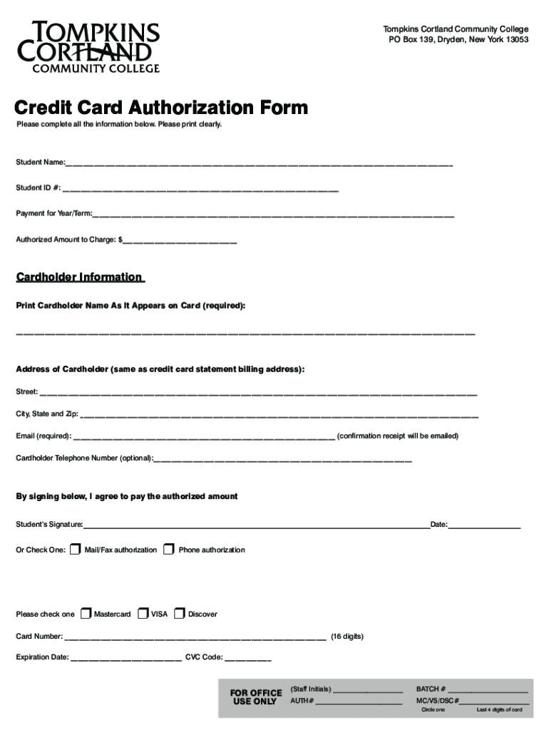 Tompkins Cortland Community College PO Box 139, Dryden, New York 13053Credit Card Authorization Form Please complete all the information below. Please print clearly. Student Name: Student ID #: Payment