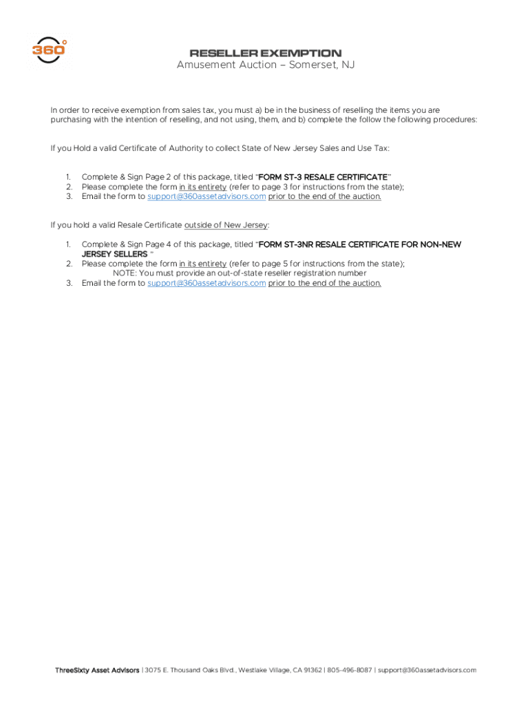 RESELLER EXEMPTION Amusement Auction Somerset, NIN order to receive exemption from sales tax, you must a) be in the business of reselling the items you are purchasing with the intention of reselling,