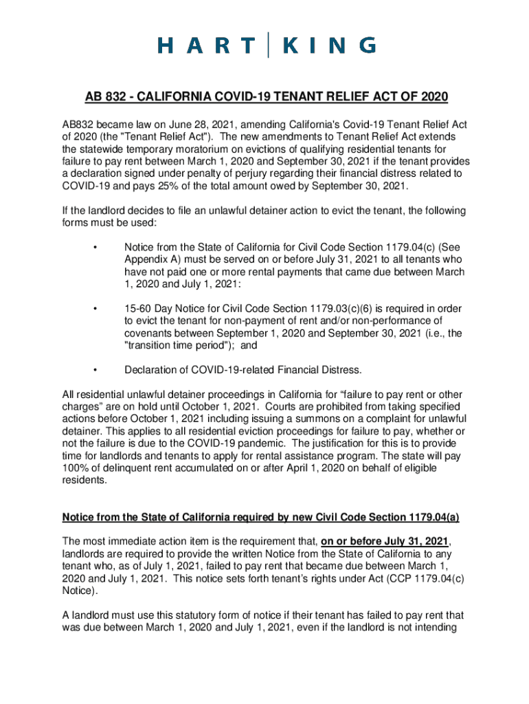 AB 832 CALIFORNIA COVID-19 TENANT RELIEF ACT OF 2020 AB832 became law on June 28, 2021, amending California's COVID-19 Tenant Relief Act of 2020 (the “Tenant Relief Act). The new amendments to Tenant