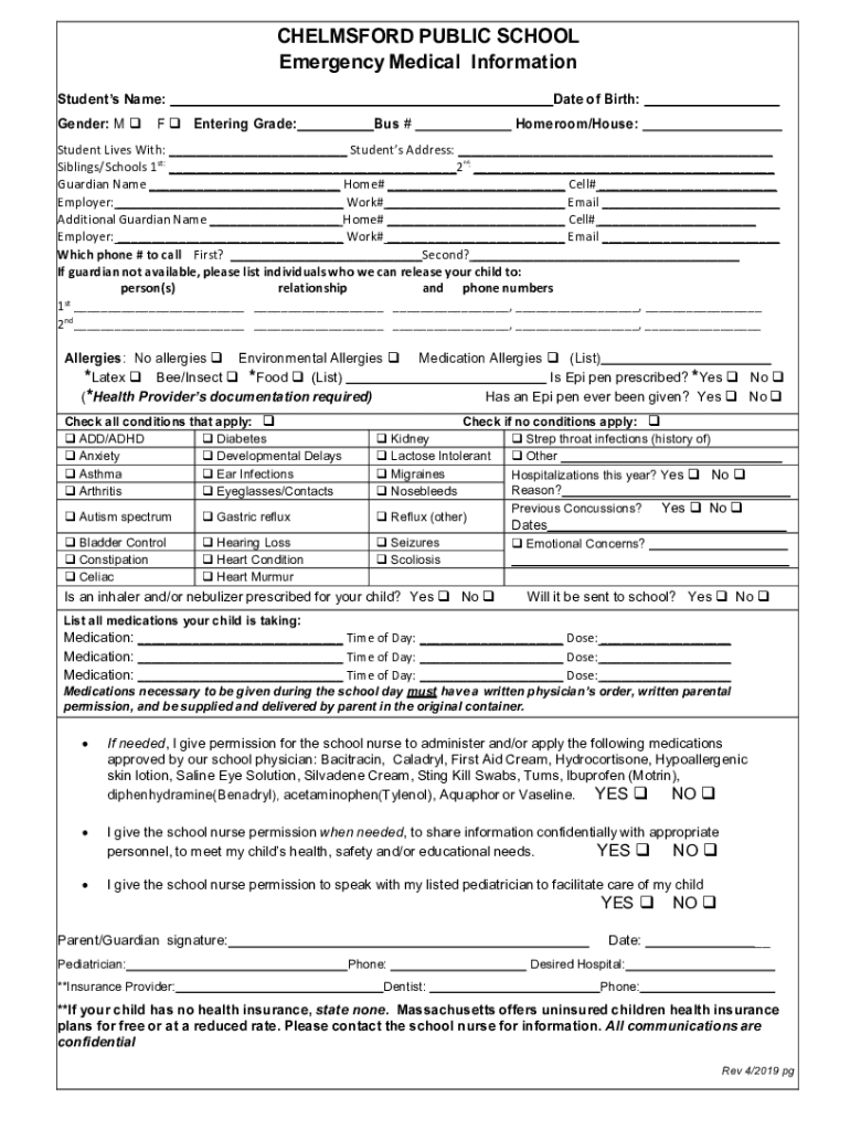 CHELMSFORD PUBLIC SCHOOL Emergency Medical Information Students Name: Gender: M date of Birth:F q Entering Grade:Bus #Homeroom/House:Student Lives With: Students Address: Siblings/Schools 1st: 2nd: