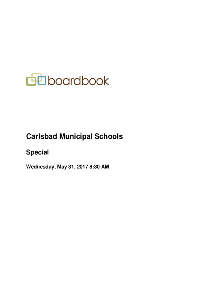Carlsbad Municipal Schools Special Wednesday, May 31, 2017 8:30 Agenda of Special Meeting Board of Education Carlsbad Municipal Schools Special meeting of the Board of Education of Carlsbad Municipal