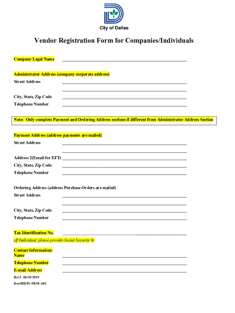 Vendor Registration Form for Companies/Individuals Company Legal Name Administrator Address (company corporate address) Street Address City, State, Zip Code Telephone Number Note: Only complete Payment