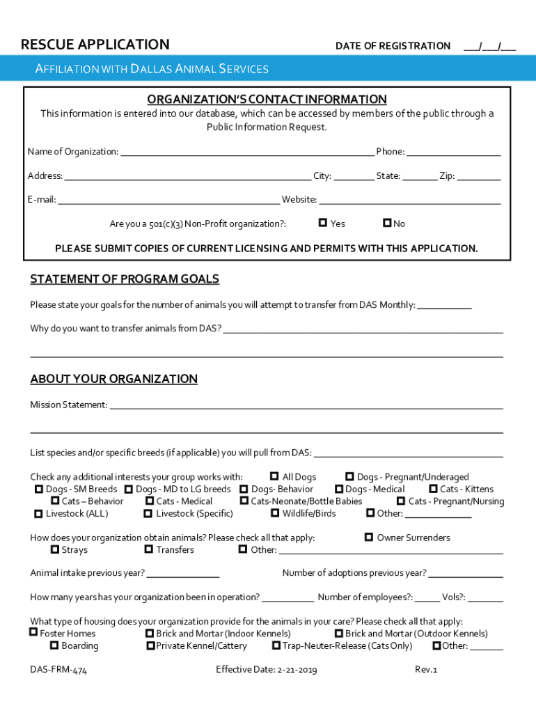RESCUE APPLICATIONDATE OF REGISTRATION / / AFFILIATION WITH DALLAS ANIMAL SERVICES ORGANIZATIONS CONTACT INFORMATION This information is entered into our database, which can be accessed by members