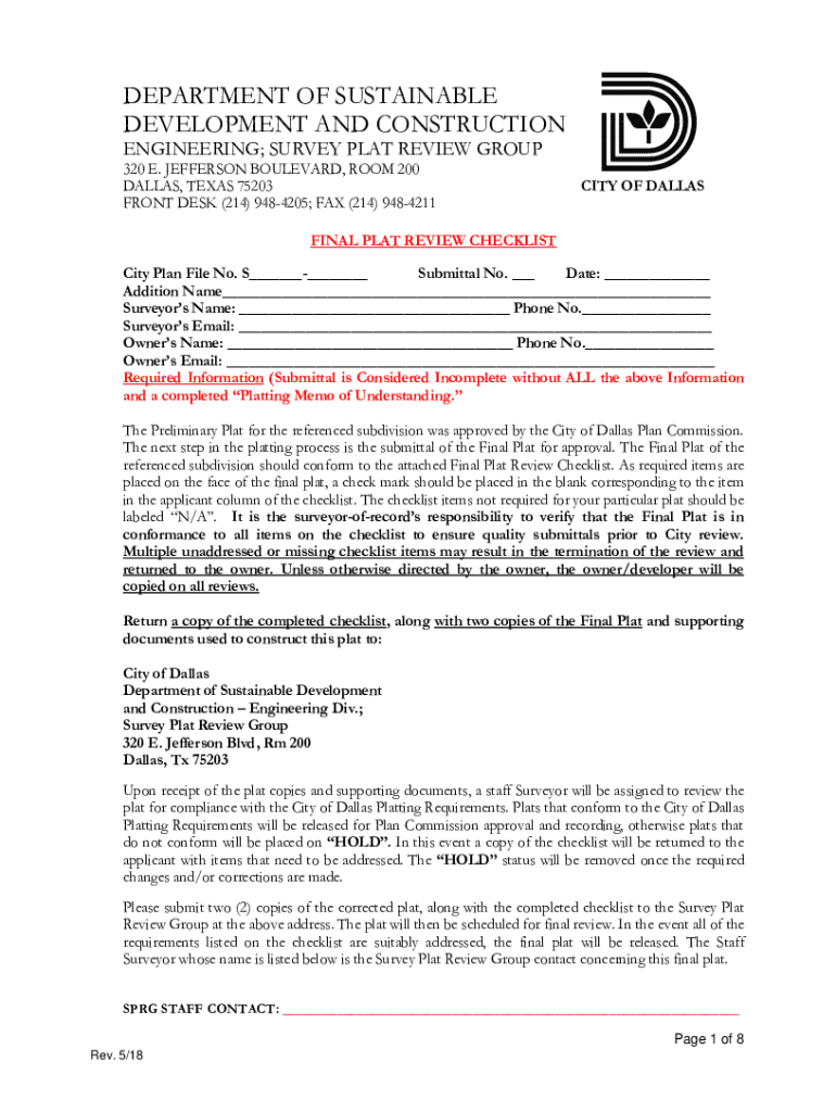 DEPARTMENT OF SUSTAINABLE DEVELOPMENT AND CONSTRUCTION ENGINEERING; SURVEY PLAT REVIEW GROUP 320 E. JEFFERSON BOULEVARD, ROOM 200 DALLAS, TEXAS 75203 FRONT DESK (214) 9484205; FAX (214) 9484211CITY
